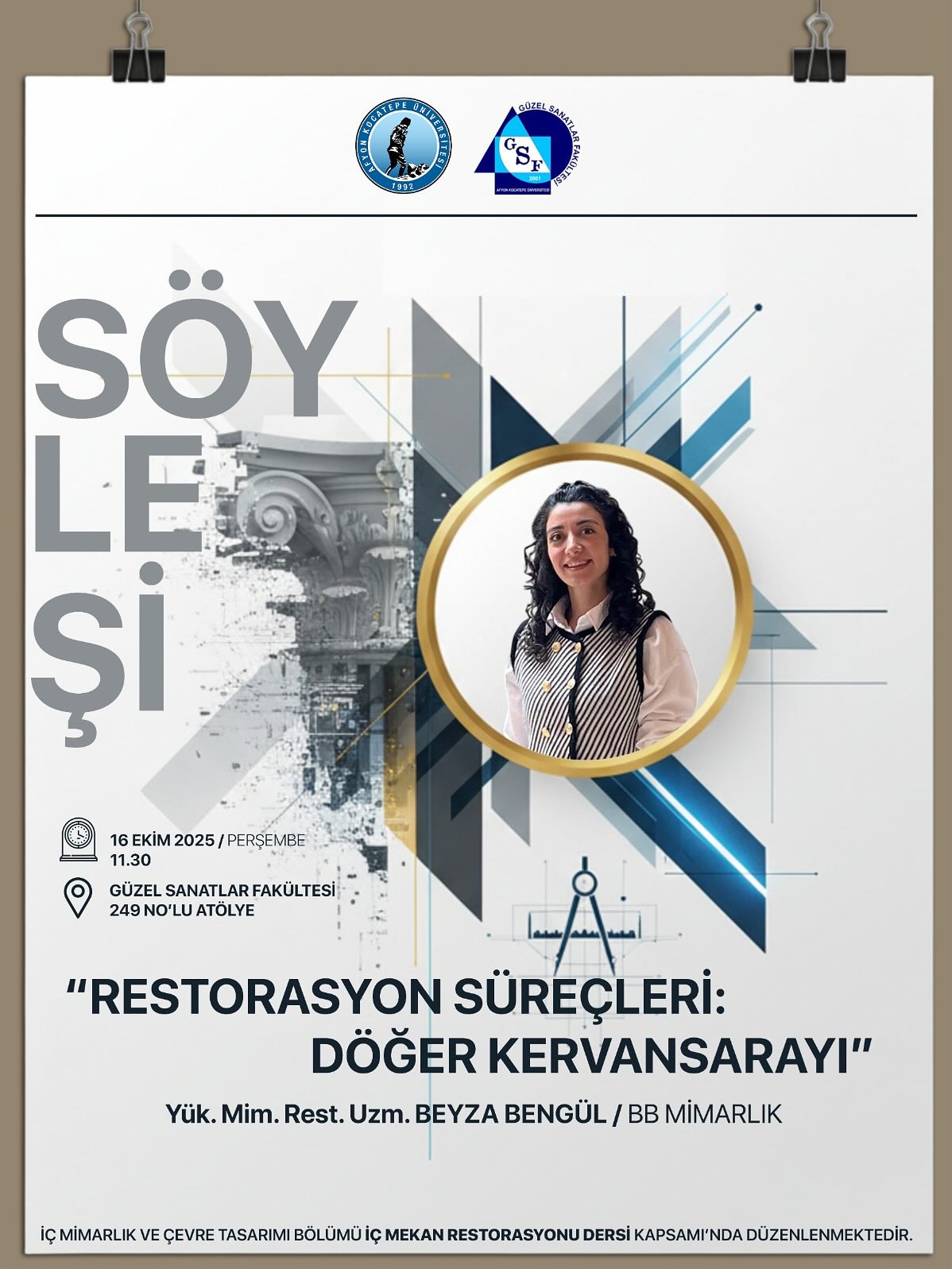 İç Mimarlık ve Çevre Tasarımı Kulübü katkılarıyla gerçekleştirilen programa, davetli konuşmacılar Yüksek Mimar – Restorasyon Uzmanı Beyza Bengül ve Mimar Bengü İnceli katılım sağlamıştır.
