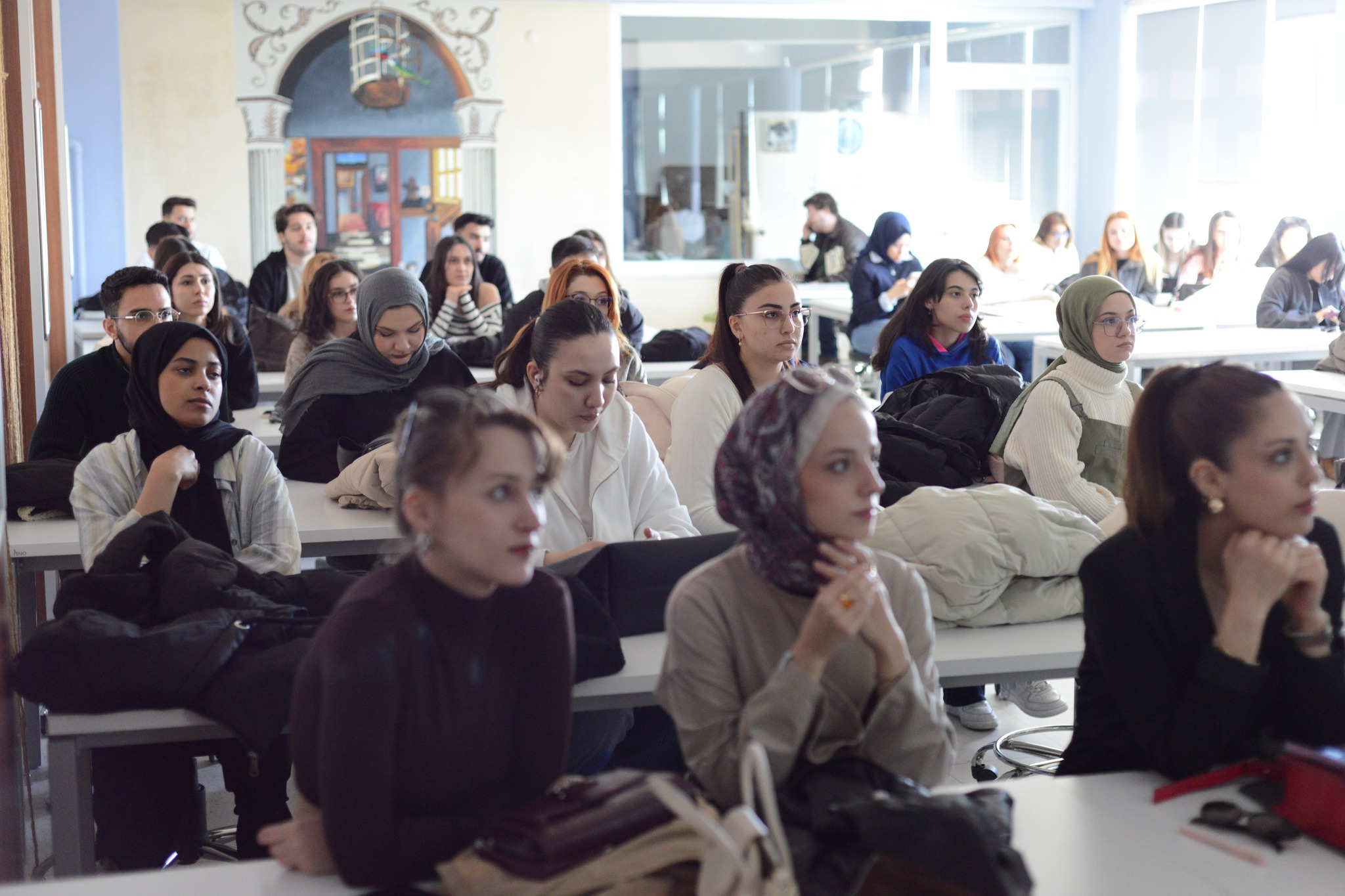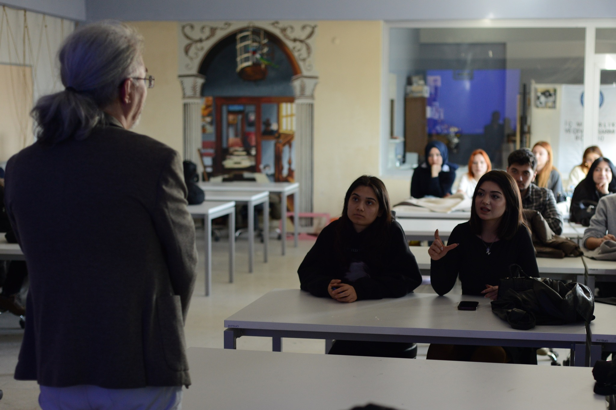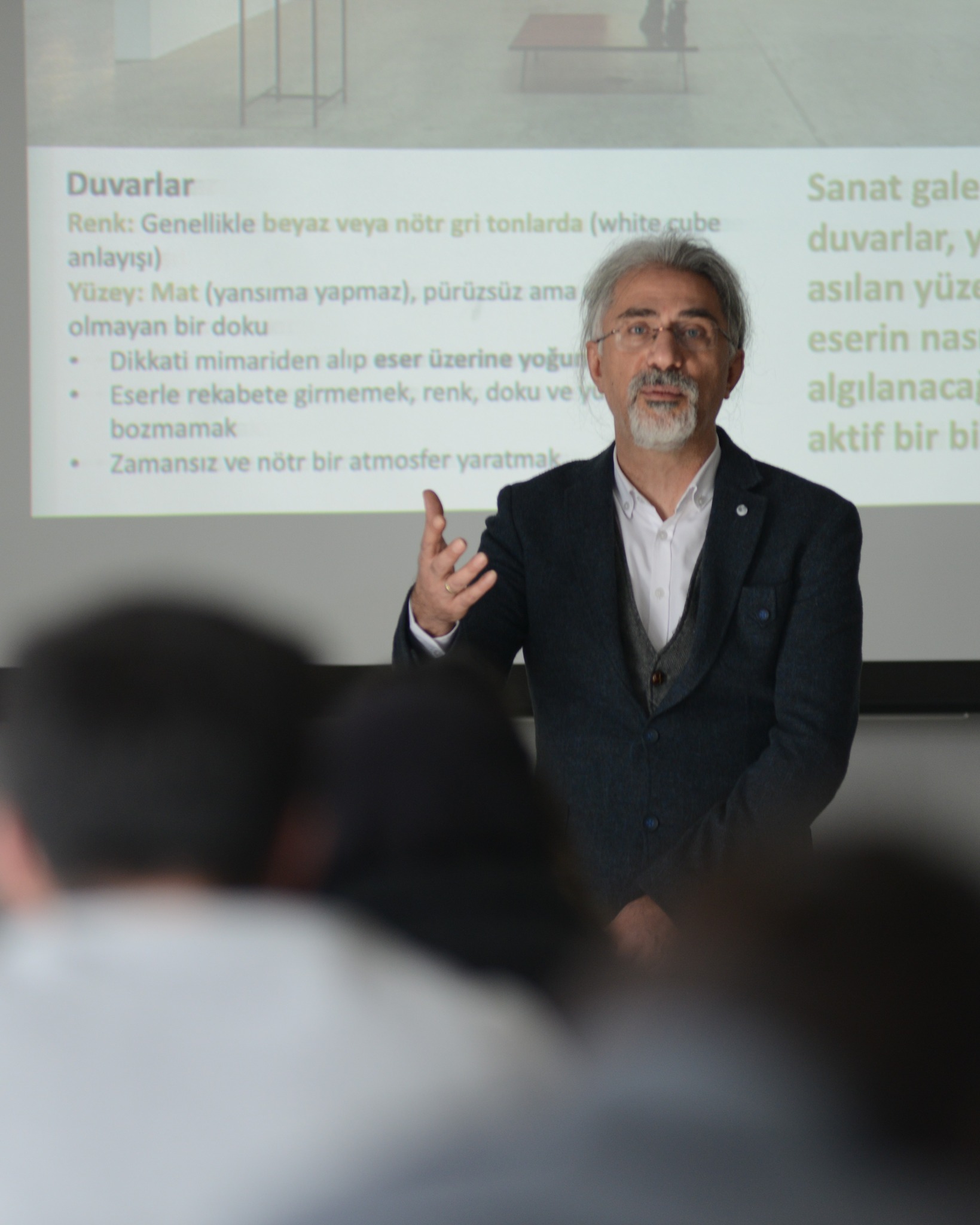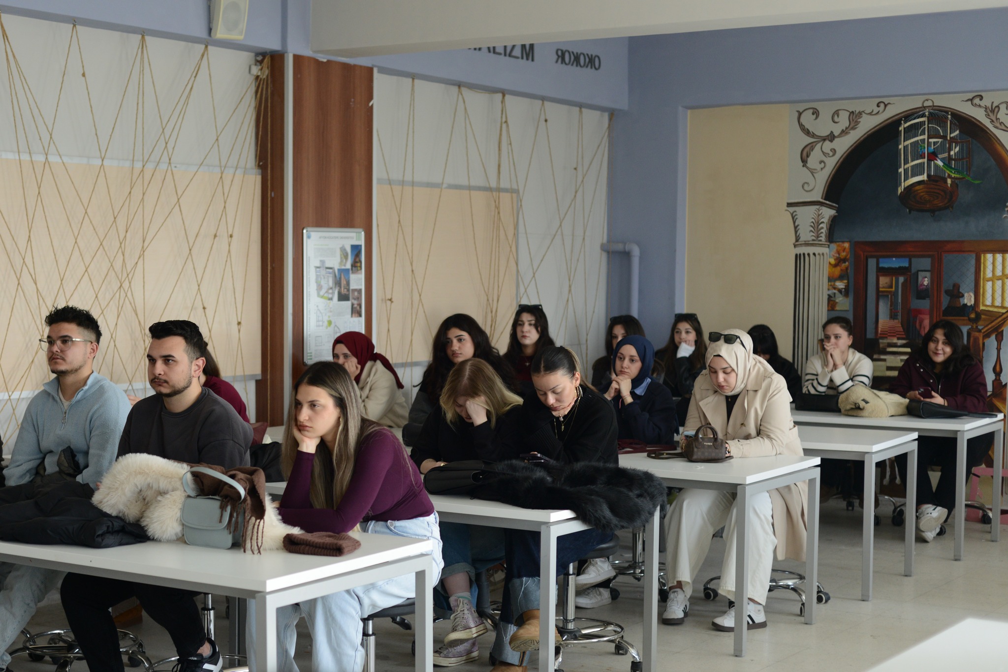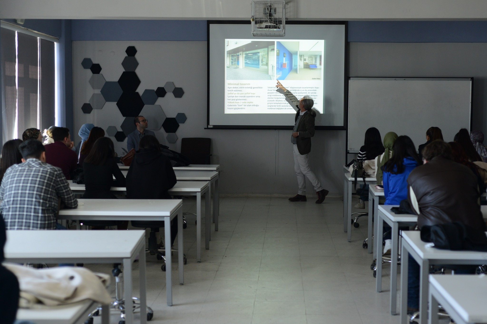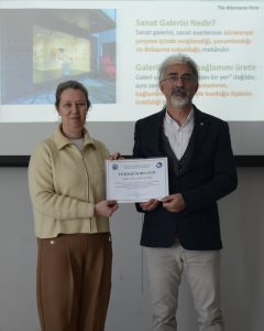 Öğrencilere verilen dönem projesine katkı sunmak amacıyla gerçekleştirilen iki ayrı oturumda, Dr. Öğretim Üyesi Kara, “sanat galerilerinin tarihsel gelişimi, galeri türleri, iç mekân tasarım kriterleri, sergileme teknikleri, aydınlatma ve dolaşım kurgusu” gibi tasarım sürecine yön verecek temel başlıklara kapsamlı biçimde değindi ve özellikle sanat eserlerinin mekân içerisinde konumlandırılması, izleyici deneyimi ve mekânsal atmosferin oluşturulmasına ilişkin tasarım ilkelerini öğrencilerle paylaştı.