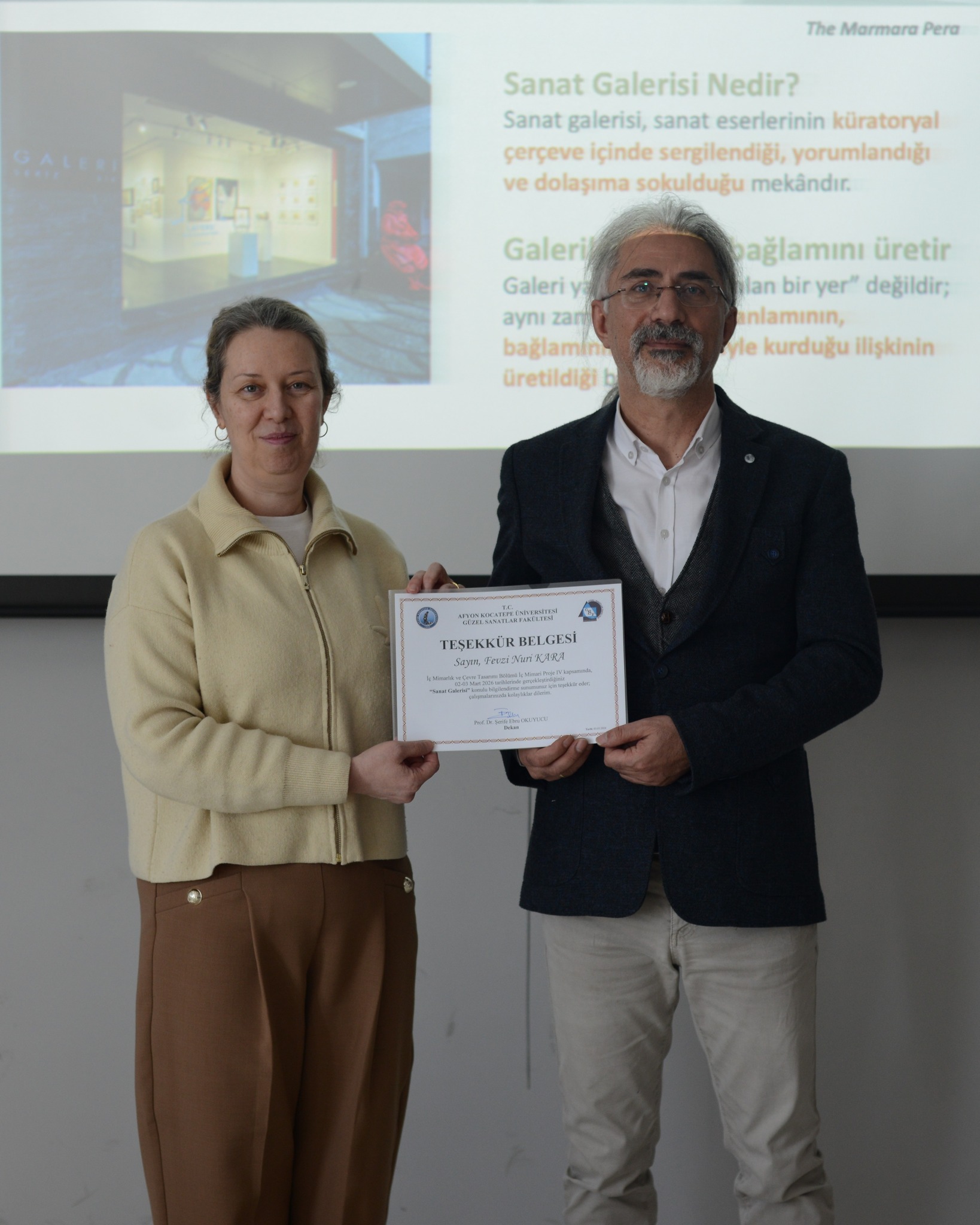 Program sonunda Dekanımız, İç Mimarlık ve Çevre Tasarımı Bölüm Başkanımız Prof. Dr. Şerife Ebru Okuyucu tarafından Dr. Öğr. Üyesi Fevzi Nuri Kara’ya katkılarından dolayı teşekkür belgesi takdim edildi.