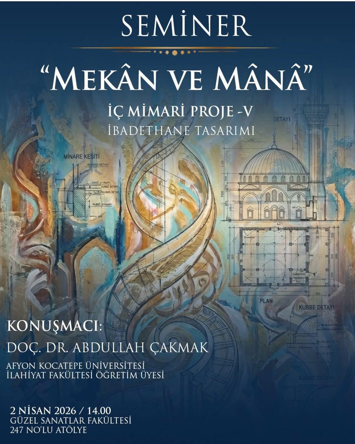Bölümümüz Öğr. Grv. Fatih Mazlum tarafından yürütülen “İç Mimari Proje V” dersi kapsamında, 2 Nisan tarihinde, “Mekân ve Mânâ” konulu bir seminer düzenlendi.